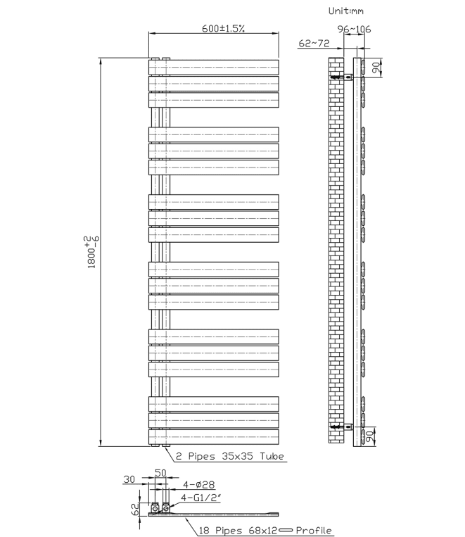 De radiator heeft een zij-onder aansluiting (1/2” euroconus binnendraad) met een standaard hartafstand van 50 mm.