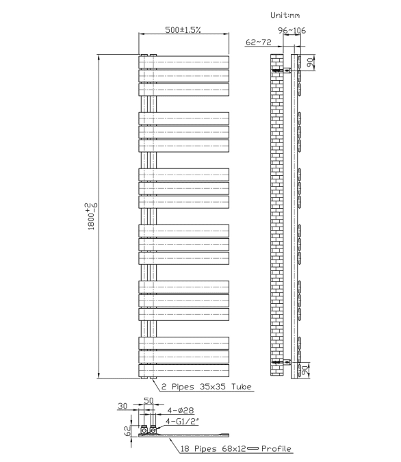 De radiator heeft een zij-onder aansluiting (1/2” euroconus binnendraad) met een standaard hartafstand van 50 mm.