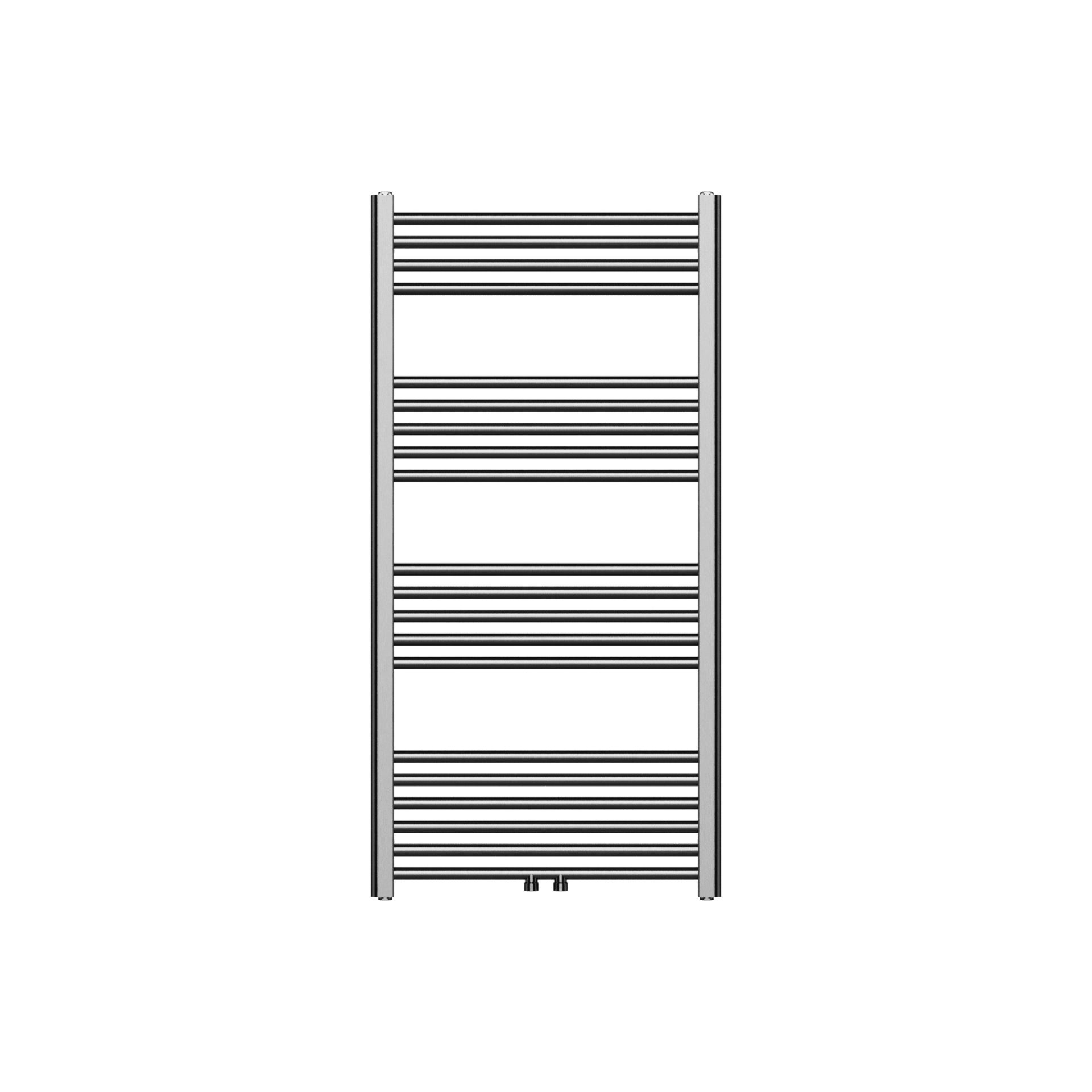 Deze handdoekradiator heeft een hoogte van 120 cm, een breedte van 60 cm en een dikte van 5 cm, en biedt een verwarmingsvermogen van 414 Watt. Met zijn moderne gunmetal grijze afwerking voegt hij een vleugje verfijning toe aan elke badkamerinrichting. De radiator beschikt over zes aansluitingen waaronder een midden-onder aansluiting, waardoor hij zeer flexibel is in installatie en perfect past in verschillende badkamerindelingen.