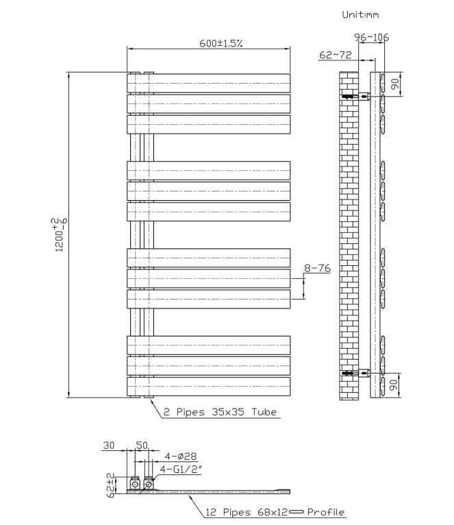 De radiator heeft een zij-onder aansluiting (1/2” euroconus binnendraad) met een standaard hartafstand van 50 mm.