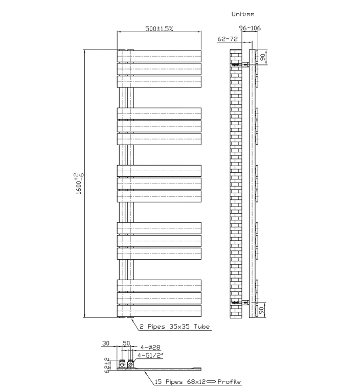 De radiator heeft een zij-onder aansluiting (1/2” euroconus binnendraad) met een standaard hartafstand van 50 mm.