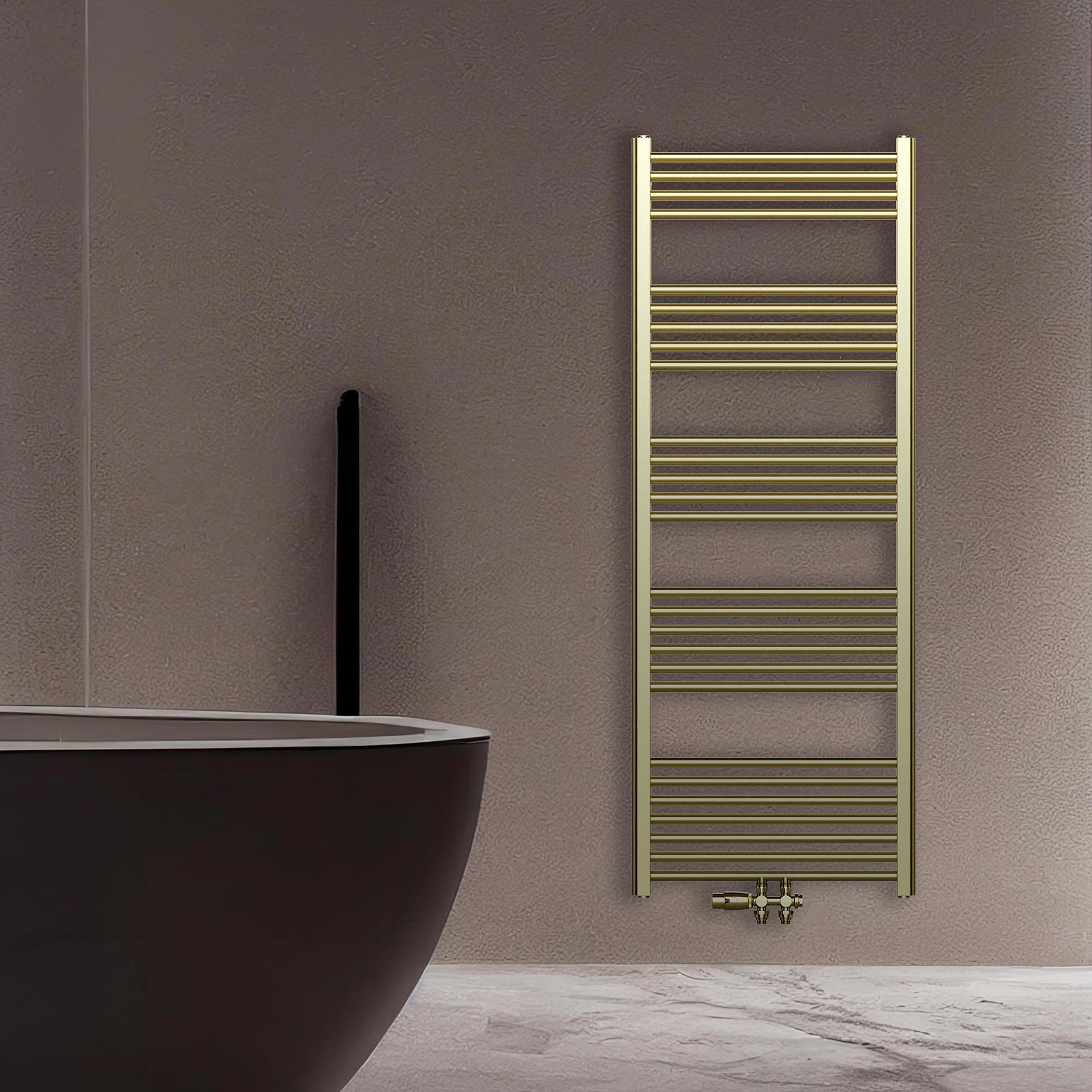 Deze stijlvolle handdoekradiator in geborsteld goud is een perfecte aanvulling voor elke moderne badkamer. Of je nu op zoek bent naar verwarming voor je handdoeken of gewoon naar een luxueuze toevoeging voor je badkamer, deze radiator biedt de perfecte combinatie van functionaliteit en esthetiek. Ideaal voor mensen die houden van luxe en comfort, maar ook voor diegenen die belang hechten aan een efficiënte verwarming van hun badkamer.