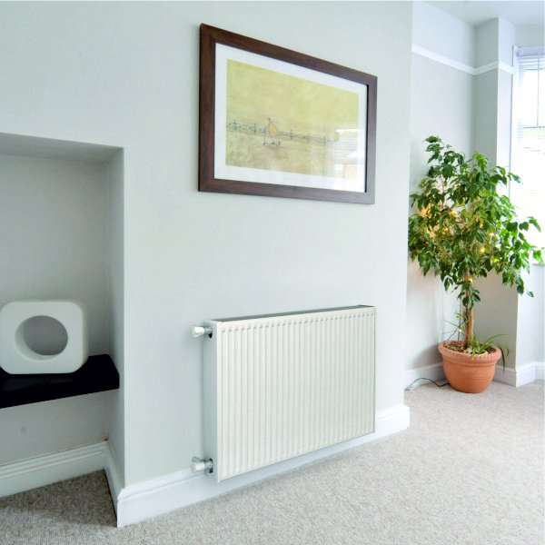 De radiator is uitgevoerd in de Type 11 (enkel plaats, enkel convector) en is dan ook maar 4,9 cm dik. Na het ophangen van de radiator zelf komt de radiator in totaal 7,9 cm of 9,4 cm van de muur af. Dit komt door de handige dubbelzijdige ophangmogelijkheid (3,0 cm of 4,5 cm) van de beugels.