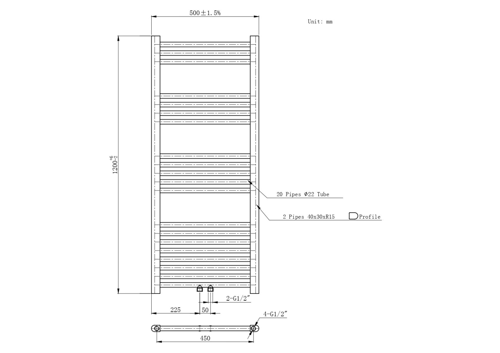 500x1200 - 673 Watt | Handdoekradiator Zwart Zij- & Middenaansluiting