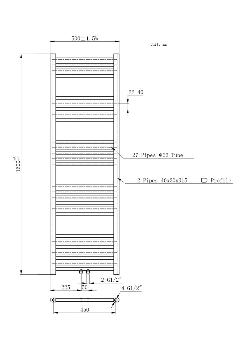 De standaard hart-op-hartafstand bij onderaansluiting bedraagt 50 mm, waardoor de radiator eenvoudig te installeren is binnen bestaande of nieuwe cv-systemen.