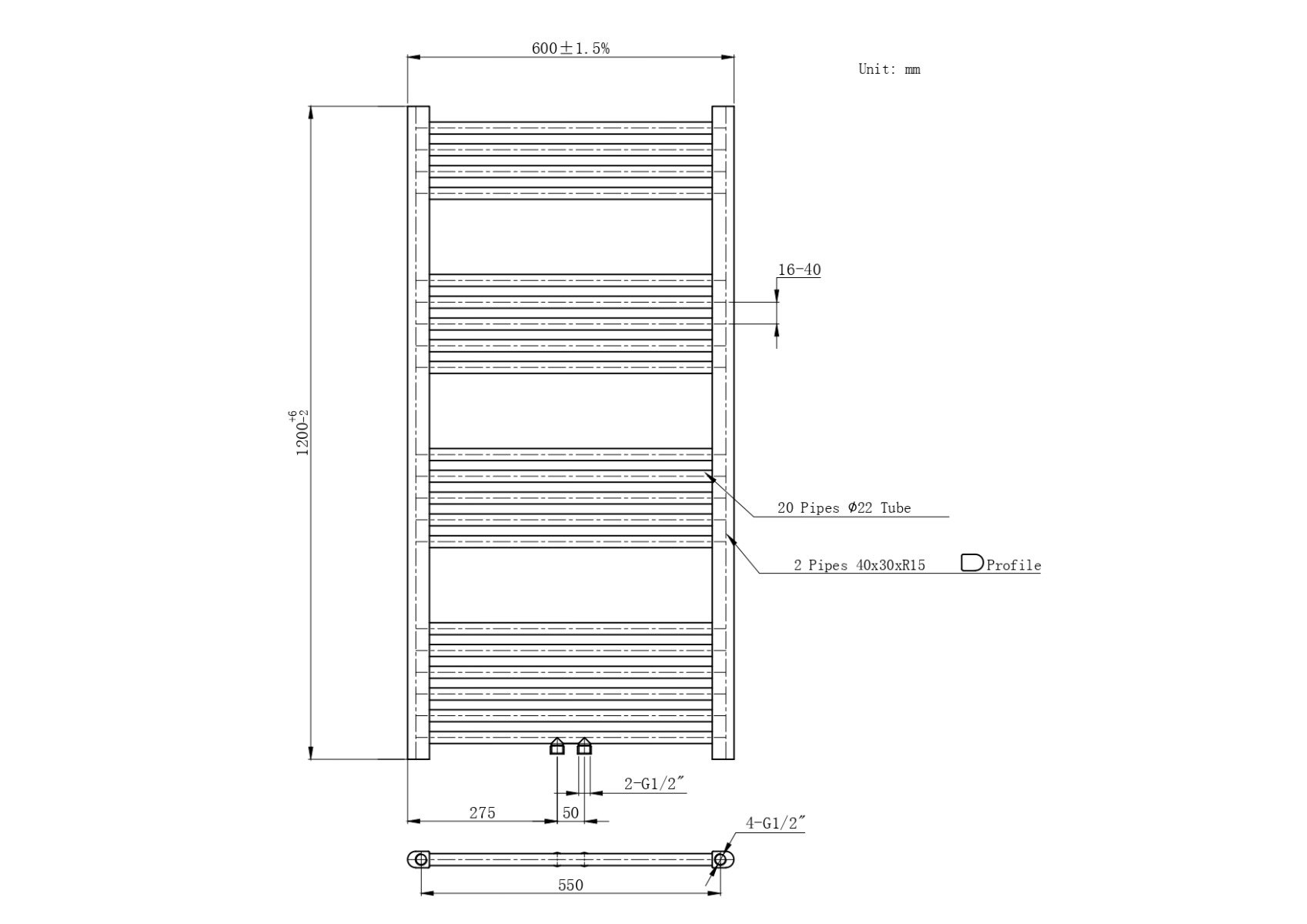 600x1200 - 794 Watt | Handdoekradiator mat goud Zij- & Middenaansluiting