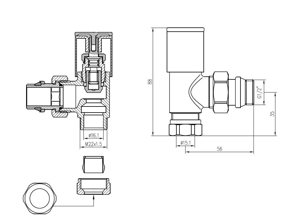 Luxe radiatorventiel 1/2" x 15 mm (M22) knel, haaks, chroom