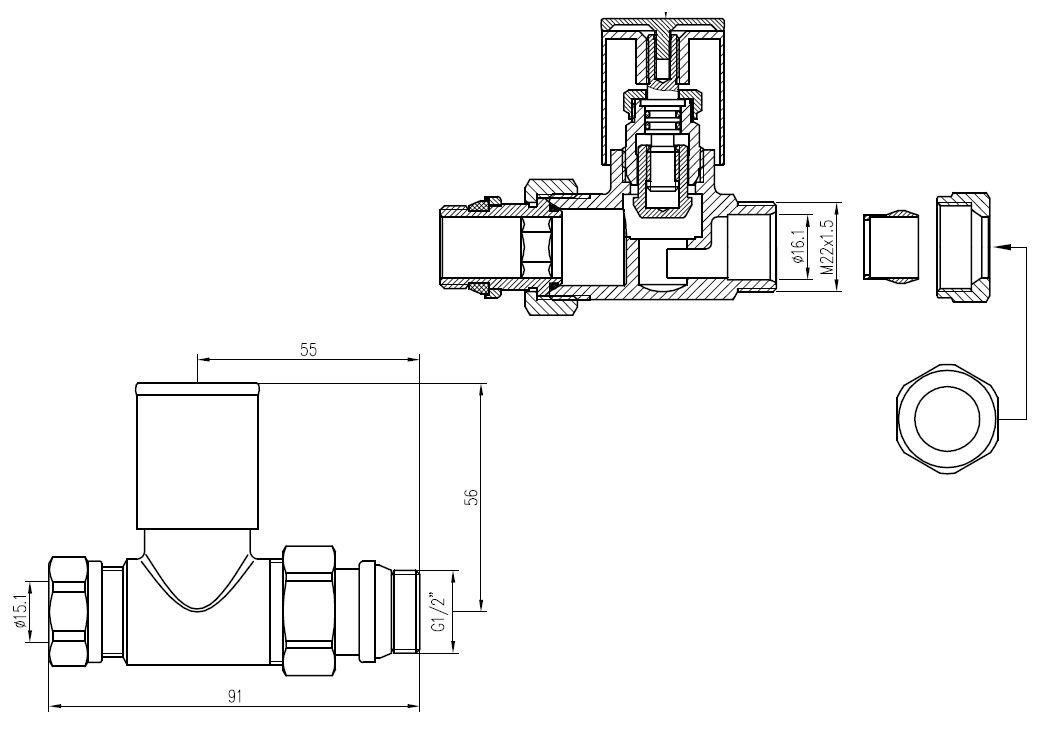 Luxe radiatorventiel 1/2" x 15 mm (M22) knel, recht, chroom