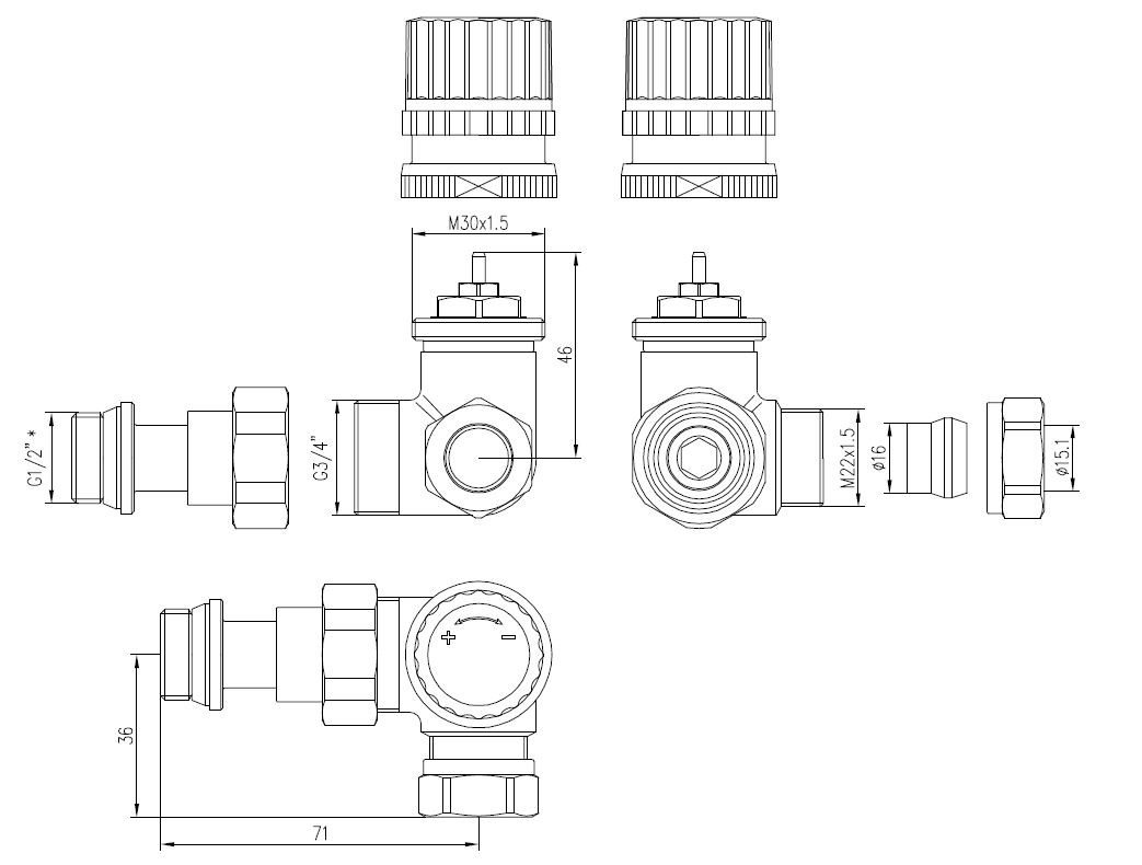 Luxe thermostatisch ventiel 1/2" x 15 mm (M22) knel, haaks links, chroom