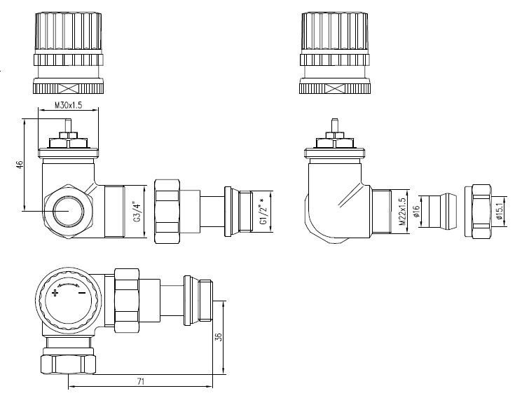 Luxe thermostatisch ventiel 1/2" x 15 mm (M22) knel, haaks rechts, chroom