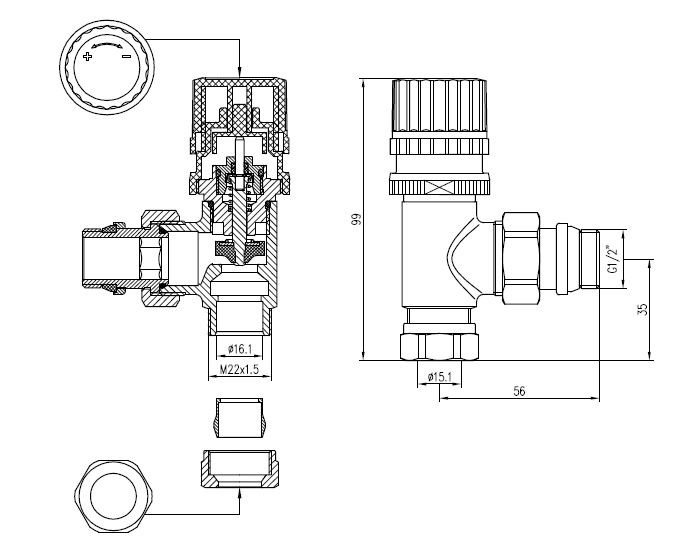 Luxe thermostatisch voorbereid ventiel 1/2" x 15 mm (M22) knel, haaks, chroom