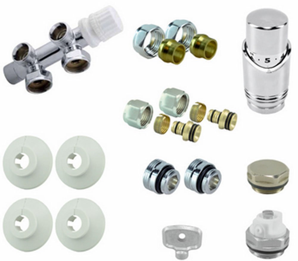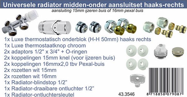 Complete set om een radiator met een midden-onder aansluiting aan te sluiten. Geschikt voor zowel 15mm knel of 16mm Pexal kunststof buis. Aansluiting naar de muur.