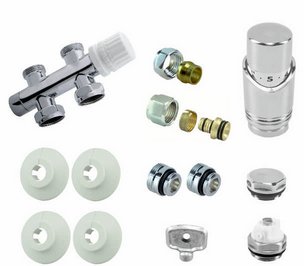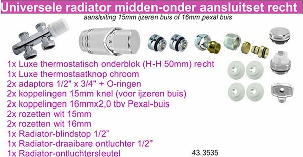 Complete set om een radiator met een midden-onder aansluiting aan te sluiten. Geschikt voor zowel 15mm knel of 16mm Pexal kunststof buis.