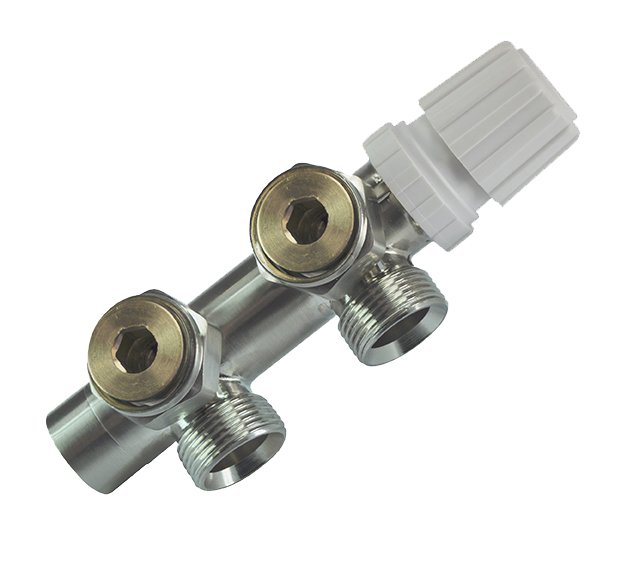 Thermostatisch onderblok 3/4", haaks-links, geborsteld staal